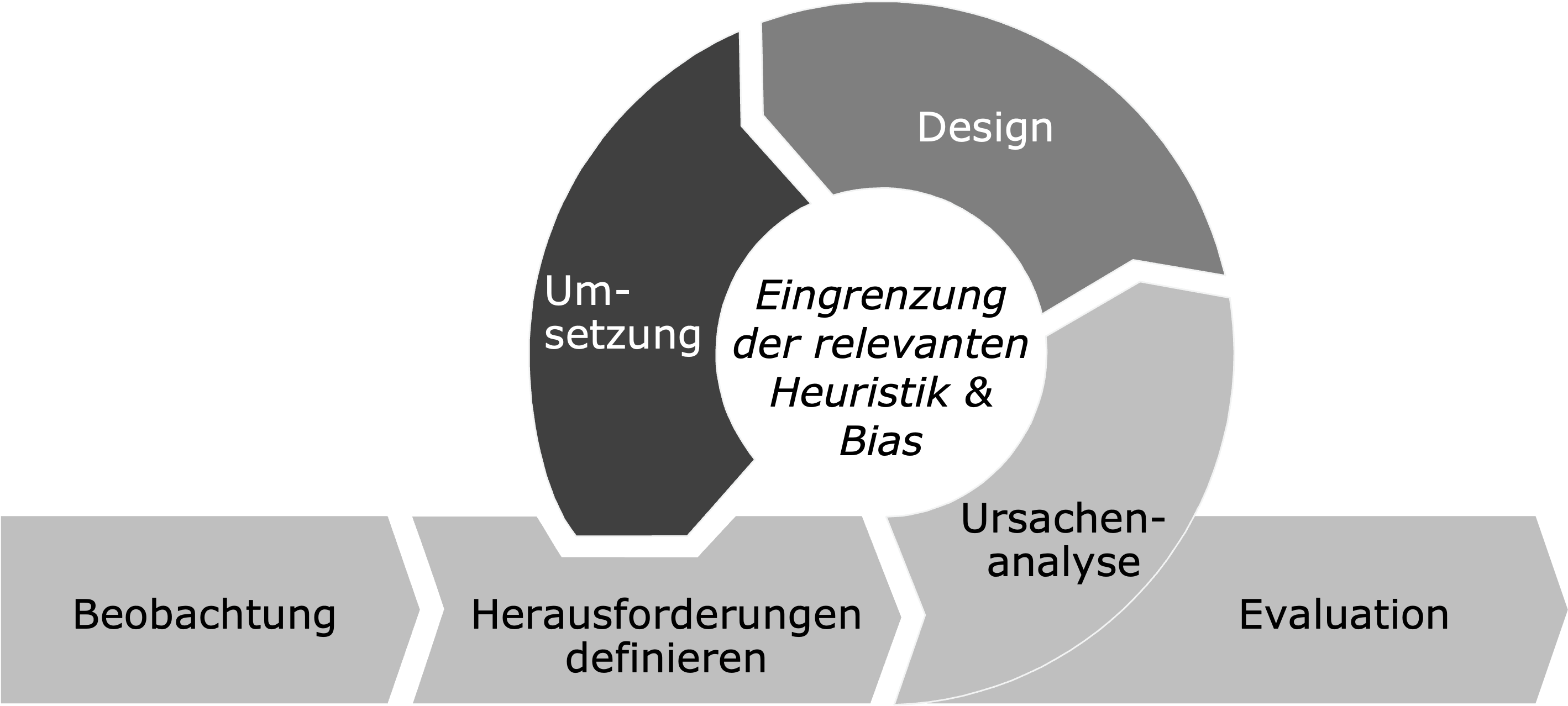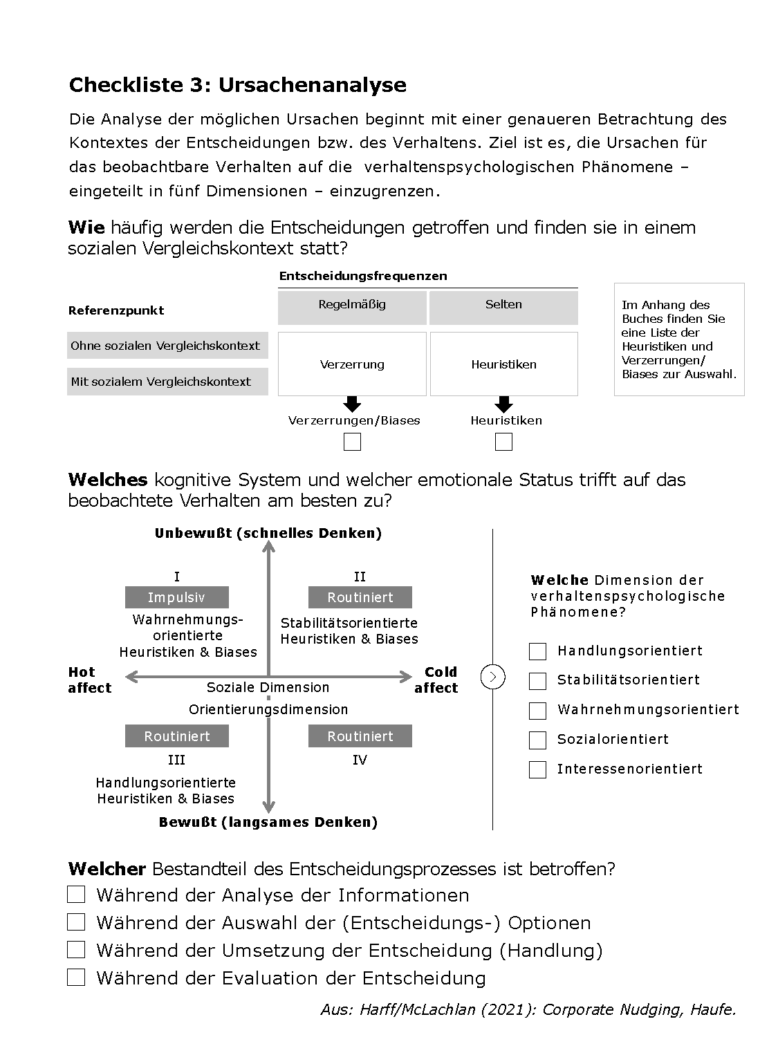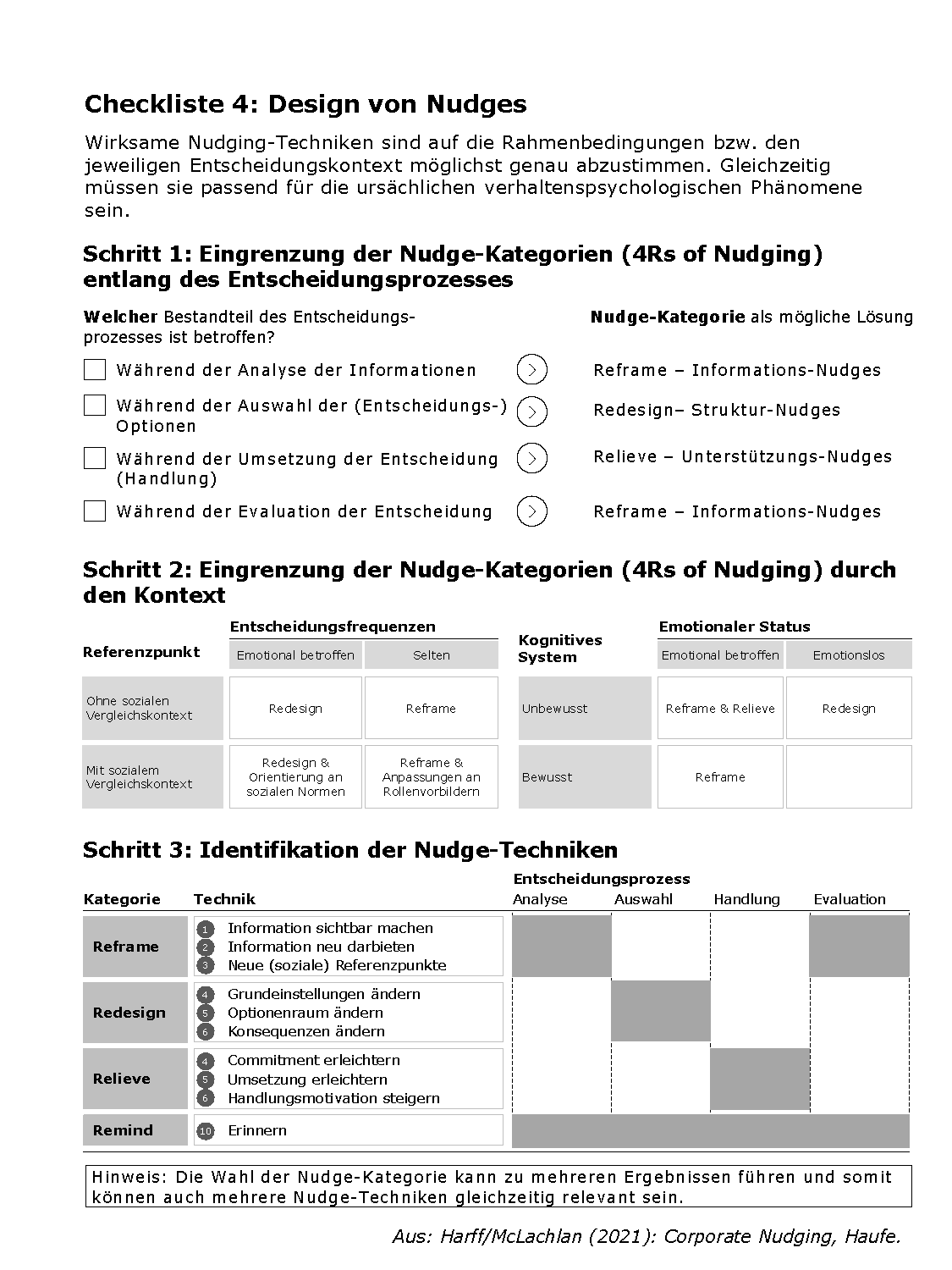 Der Entwicklungsprozess für Nudges (siehe Abbildung) ist in der Ursachenanalyse eng mit den verhaltenspsychologischen Phänomenen (Heuristiken und Verzerrungen/Biases) verwoben. Um eine eigene Umsetzung von Nudges im eigenen Umfeld zu erleichtern, stellen wir vier Checklisten als Download zur Verfügung.